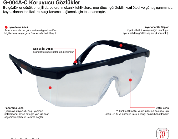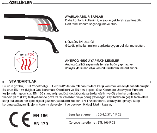 Bu gözlükler düşük enerjili darbelere, mekanik tehlikelere, mor ötesi, görülebilir kızıl ötesi ve güneş ışınımından kaynaklanan tehlikelere karşı koruma sağlamak için tasarlanmıştır. Spor dizaynı  sayesinde kullanıcılar tarafından daha çok tercih edilir.