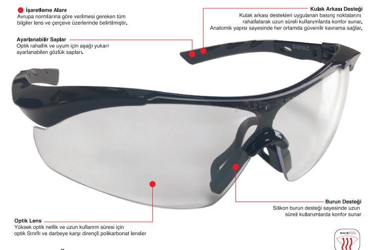 Bu gözlükler düşük enerjili darbelere, mekanik tehlikelere, mor ötesi, görülebilir kızıl ötesi ve güneş ışınımından kaynaklanan tehlikelere karşı koruma sağlamak için tasarlanmıştır. Spor dizaynı sayesinde kullanıcılar tarafından daha çok tercih edilir.